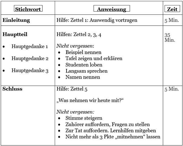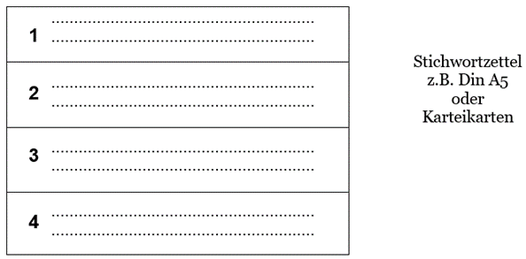Allerdings müssen die Stichwortzettel, möglichst auf Karteikarten, übersichtlich sein, d.h.: nur einseitig beschreiben und Stichworte nummerieren. Bei jeder Karte beginnt die Stichwortnummerierung wieder mit 1.