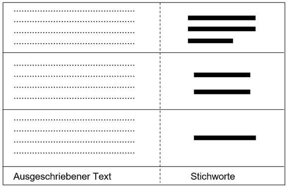 Sind Sie weniger sicher, dann schreiben Sie das Stundenmanuskript aus – aber nach rechts oder links versetzt. Überall dort, wo Sie eine Pause machen wollen, zeichnen Sie einen Längsstrich ( ▌). Beim Vortrag ▌lesen Sie dann von Strich zu Strich, ▌nehmen Blickkontakt auf ▌und sprechen weiter. ▌ Außerdem schreiben Sie sich ▌ auf den freien Teil der Seite ▌ Stichworte. ▌ Sie können dann ▌ auch nur nach diesen Stichworten sprechen ▌– aber eben immer wieder aufs Manuskript, ▌ notfalls, ▌ zurückgreifen.