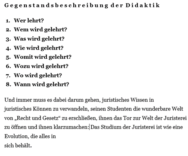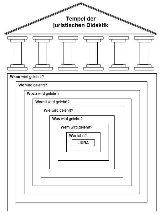 Die didaktische Leitfrage lautet: Wer lehrt wem was wie womit wozu wo und wann, um juristisches Wissen zu vermitteln und dieses in juristisches Können zu verwandeln?