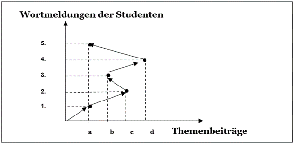Nehmen wir an, es stehen vier verschiedene Themenbeiträge a, b, c, d zur Diskussion, und es liegen fünf Wortmeldungen der Studenten 1, 2, 3, 4, 5 vor, die sich jeweils auf eines dieser Themen beziehen. Da die zufällige Reihenfolge der Wortmeldungen nicht mit einer sachlich gebotenen Reihenfolge der Themen zu tun hat, entsteht etwa die in der Abbildung gezeigte Zickzacklinie.