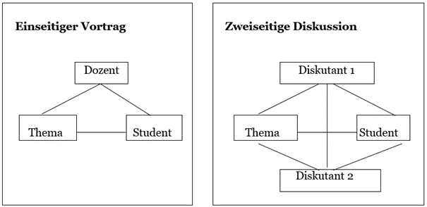 Aber auch dann bleibt die Struktur der Diskussion komplex. Während der einseitige Lehr-Vortrag nur drei Beziehungen kennt, nämlich Dozent – Thema – Student -, sind es bei der dialogischen Diskussion bereits sechs Beziehungen, nämlich Diskutant 1 – Thema – Student; Diskutant 2 – Thema – Student.