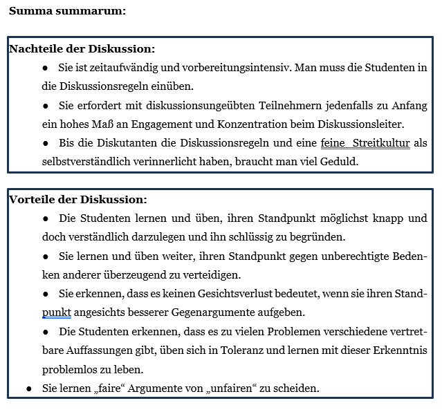 Irgendwann muss man sich als Dozent an diese Hindernisse herantasten! Irgendwann muss man mit seinen Jurastudenten diskutieren! Unsere Zeit ist nun einmal diskussionsfreudig. Die Juristen waren es eigentlich schon immer. Man muss die Studenten öfter aus ihrer geduckten, jurapaukenden Welt herausholen und in die freie Welt aktiver juristischer Diskussionen führen. Sie müssen es lernen! Sie dienen materiell der Wahrheitsfindung und formell der Schulung argumentatorischer und dialektischer Fähigkeiten und sind ein hoher didaktischer Wert für die Förderung, Gelerntes selbstständig anzuwenden. Und so gelingt es: