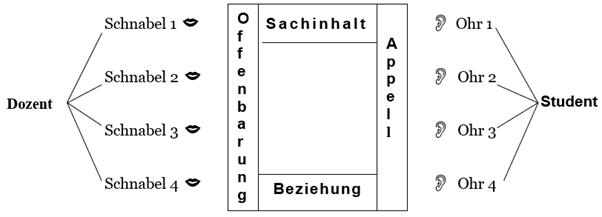 Ohne Kommunikation im Hörsaal funktioniert keine Lehre! – Aber wer kennt sich mit ihr so richtig aus? – Ein paar Worte dazu: Das bedeutendste Axiom der Kommunikation lautet: Man kann nicht nicht kommunizieren. Als Dozent kommuniziert man immer. Vom Betreten des Hörsaals bis zum Verlassen: Gestik, Mimik, Sprechen, Gehen, Stehen, Sitzen, Reden, Lächeln, Schweigen – einfach immer. Daher gilt es als Dozent, diese Kommunikationsreize so gezielt wie möglich für seine Lehrziele einzusetzen. Es ist eine faszinierende „Entdeckung“, dass ein und dieselbe Nachricht stets vier Mitteilungen gleichzeitig enthält, ob man will oder nicht. Dozenten reden bildlich mit den berühmten vier Schnäbeln und verkünden vier Botschaften in vier studentische Ohren. Der Student hat dabei grundsätzlich die freie Auswahl, mit welchem Ohr er stärker oder schwächer, empfindlicher oder abgestumpfter hört, welches Ohr er an- und welches er abschaltet. Das macht das Dozenten-Studenten-Verhältnis so kompliziert!